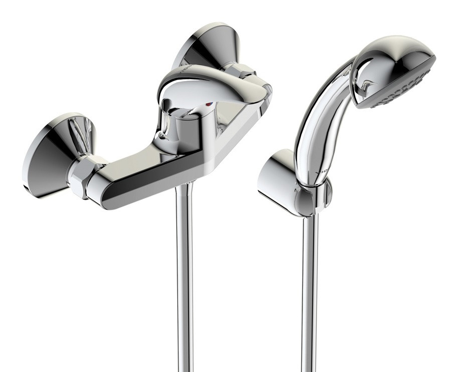 ORION Настенный смеситель для душа, монтаж на стандартных эксцентриках (в комплекте: эксцентрики, металлические отражатели, уплотнительные прокладки), керамический картридж 35 мм, металлическая рукоятка с индикаторами горячей / холодной воды, душевой гарнитур в комплекте (душевая лейка Ø70 мм, металлический шланг 1500 мм, держатель для лейки)