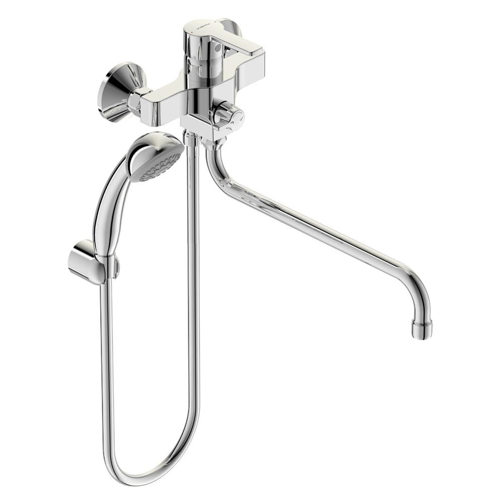 VIDIMA UNO Настенный смеситель для ванны/душа, с керамическим переключателем, монтаж на стандартных эксцентриках (в комплекте: эксцентрики, металлические отражатели, уплотнительные прокладки), трубчатый поворотный излив 250 мм, угол поворота 360º, аэратор Perlator, керамический картридж 35 мм, металлическая рукоятка с индикаторами горячей / холодной воды, ручное переключение ванна/душ, душевой гарнитур в комплекте (душевая лейка 70 мм, металлический шланг 1500 мм, держатель для лейки)