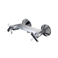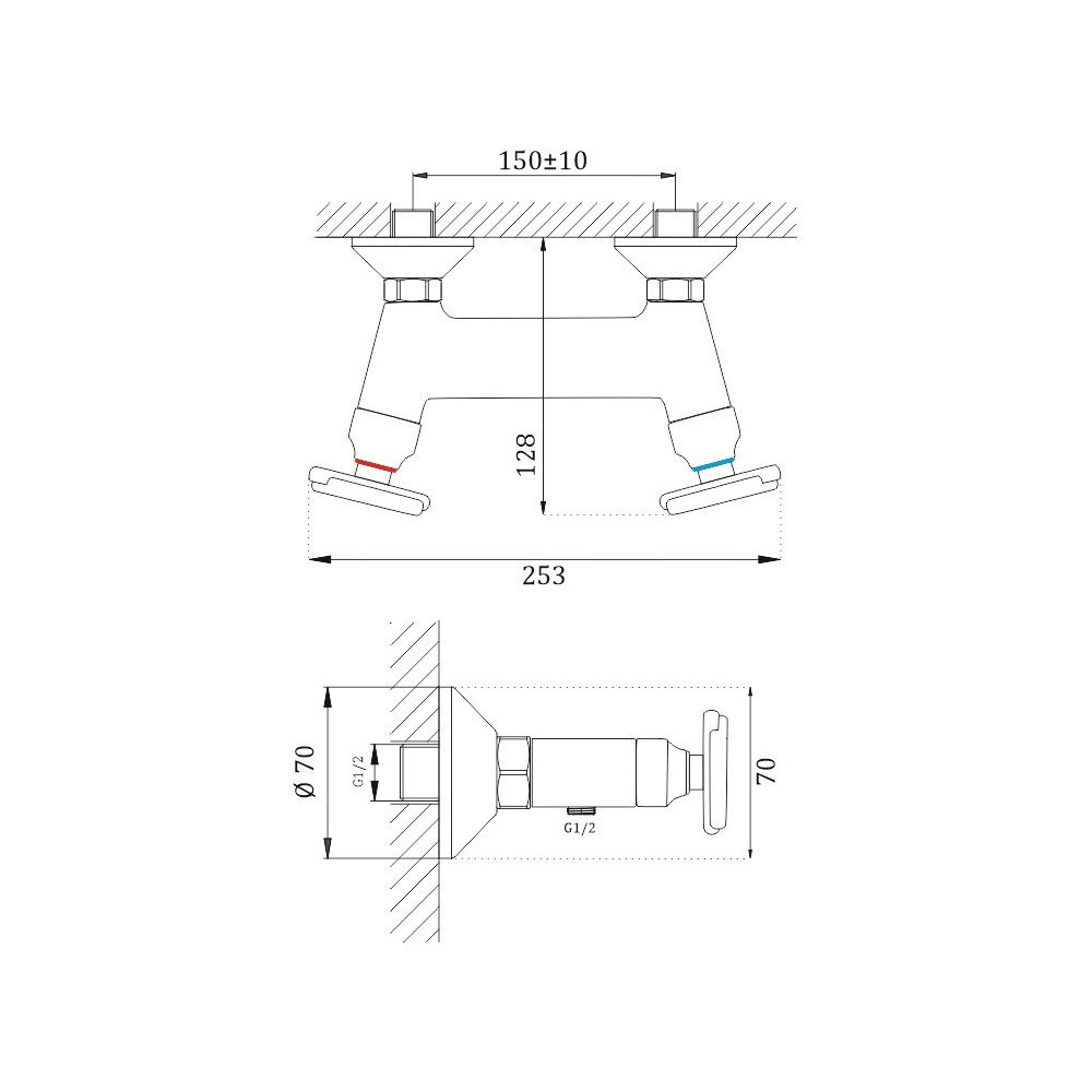 Смеситель изготовлен из латуни. Диаметр декоративных чашек 70 мм. Душевой гарнитур в комплекте. Межосевое расстояние (расстояние между выходом горячей и холодной трубы) 150 мм. Данное расстояние изменяется за счет входящих в комплект эксцентриков на 10 мм. в большую или меньшую стороны. Цвет хром.