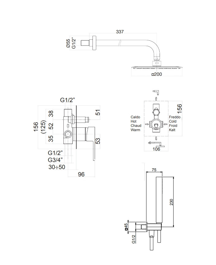 Комплектация: Смеситель, верхний/руной душ, шланговое подсоединение с душевым гарнитуром;