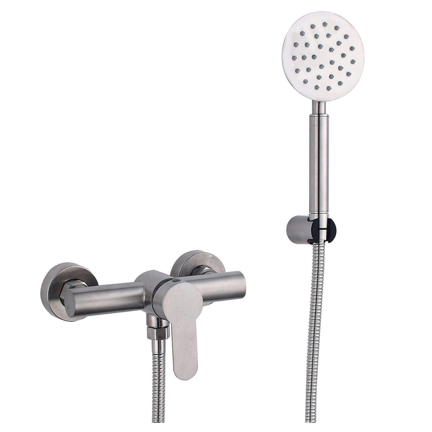 Смеситель для душа Fmark FS8203. Выполнен из нержавеющей стали. Душевой гарнитур в комплекте. Длина шланга: 150 см. Размер лейки: 9,8 см. Матовая поверхность. Керамический картридж. Подводка 1/2". Гарантия: 5 лет