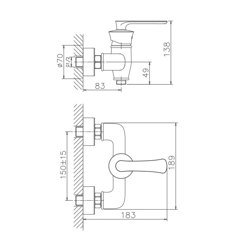 Смеситель изготовлен из латуни. Диаметр декоративных чашек 70 мм. Душевой гарнитур в комплекте. Межосевое расстояние (расстояние между выходом горячей и холодной трубы) 150 мм. Данное расстояние изменяется за счет входящих в комплект эксцентриков на 15 мм. в большую или меньшую стороны. Цвет хром.