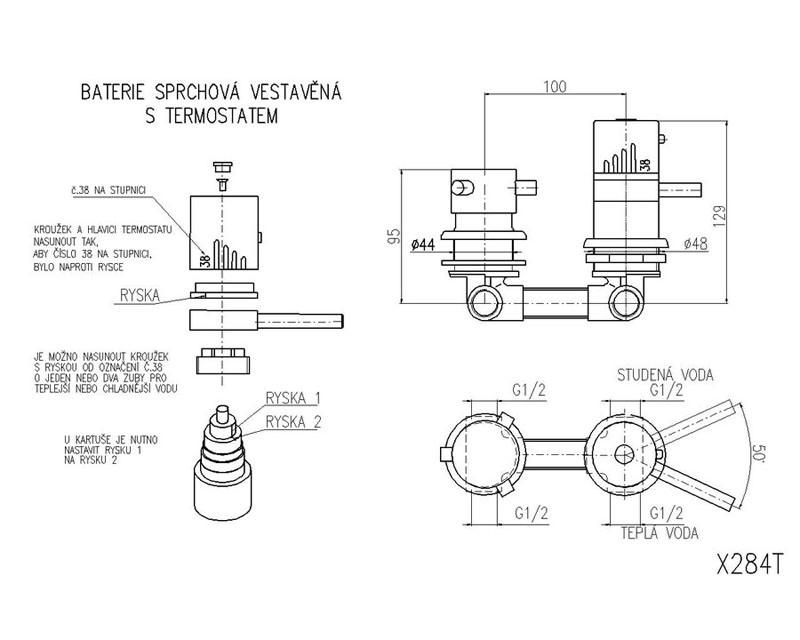 Встраиваемый термостат для ванны Rav Slezak X284T, однорычажный, с переключателем на 2 позиции. Качественный термостатический картридж 40 мм. Подвод воды G1/2. В комплекте внешняя и внутренняя части смесителя и комплект крепления.