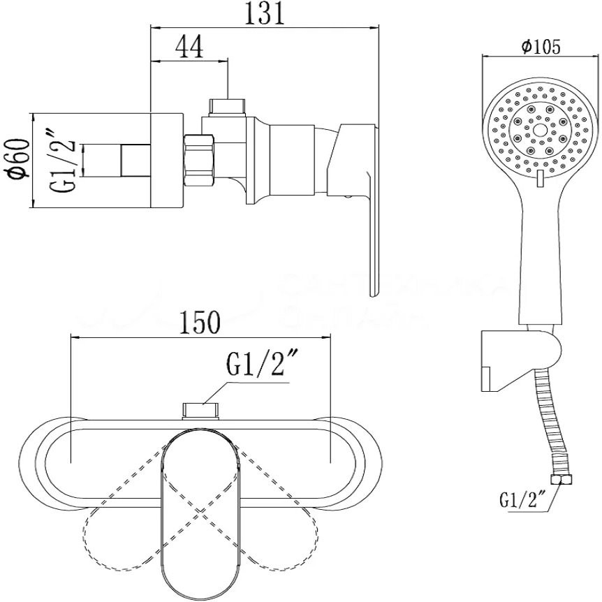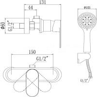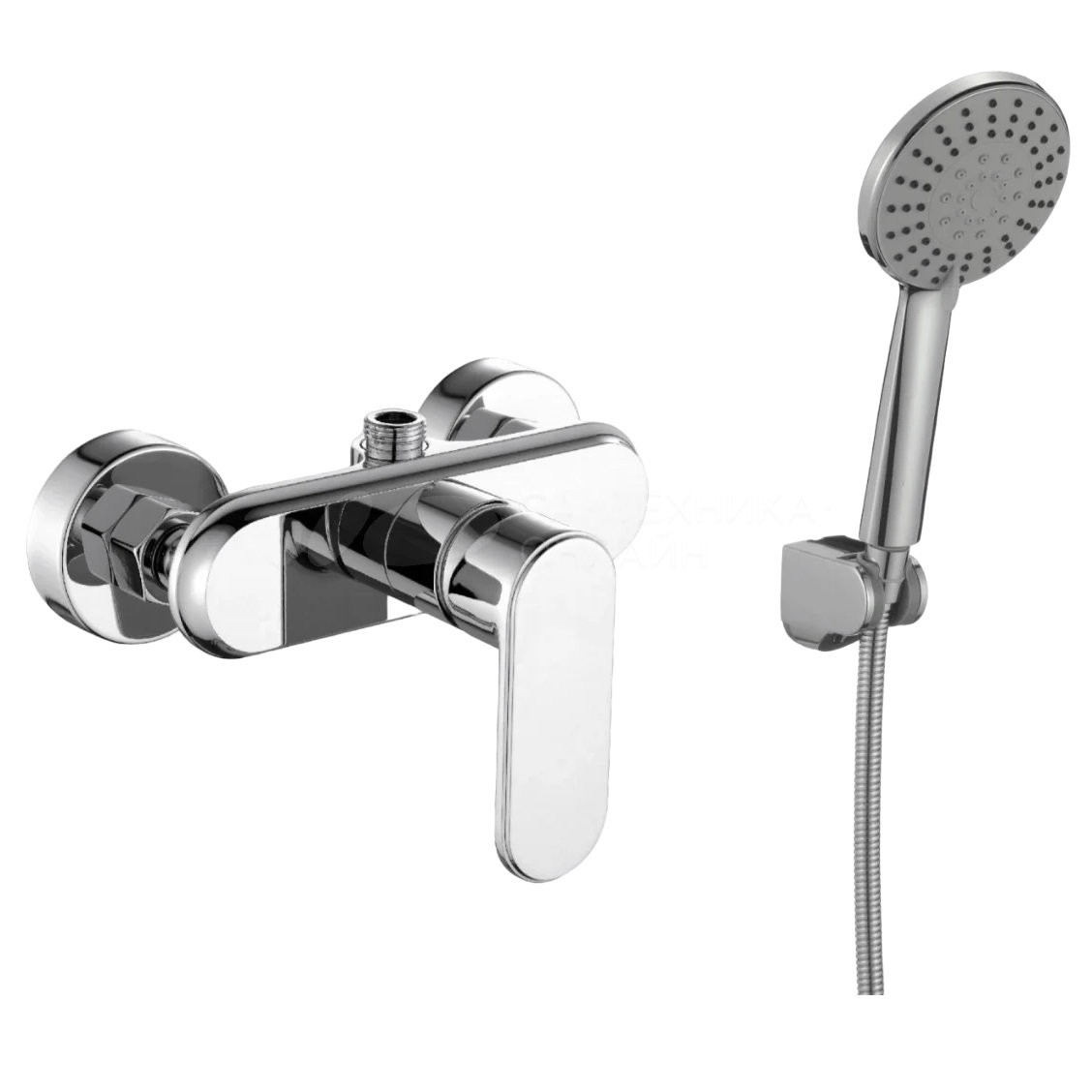 Комплектация: смеситель, душевая лейка, шланг, эксцентрики, настенный держатель;