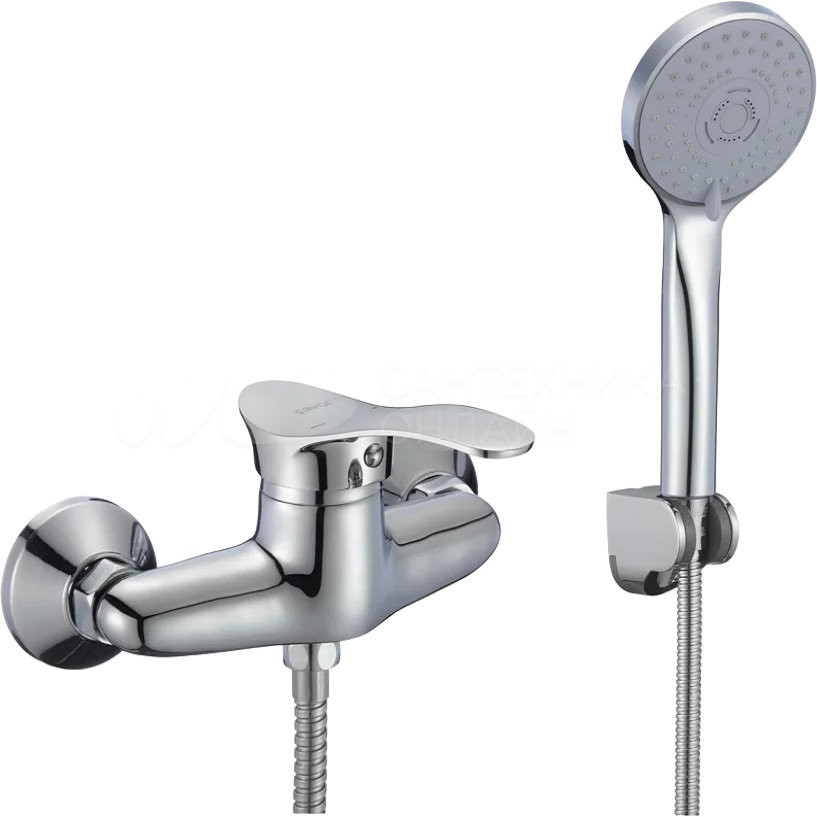 Комплектация: смеситель, душевая лейка, шланг, эксцентрики, настенный держатель;