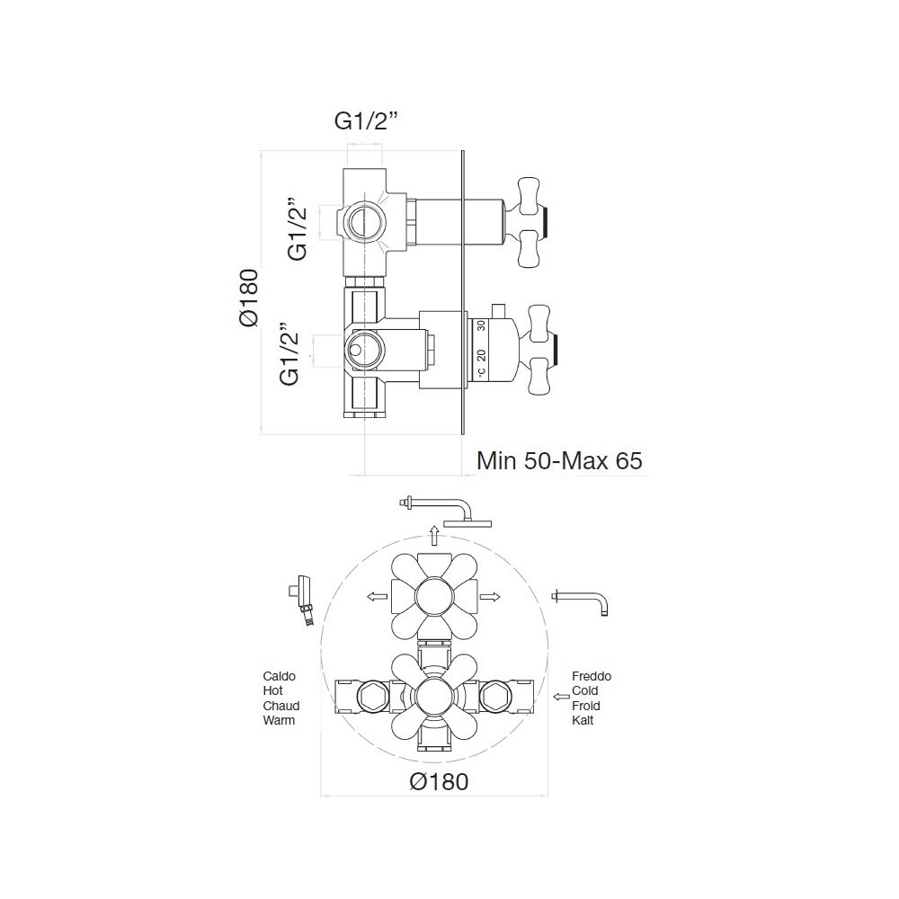 Смеситель для душа встраиваемый Webert Armony с термостатом, на 3 поток. Внутренняя часть в комплекте. Материал: латунь. Стиль ретро.
