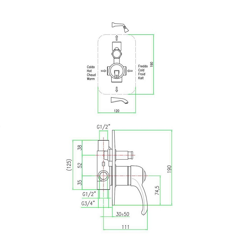 Смеситель для душа встраиваемый Webert Aurora с девиатором, на 2 потока. Внутренняя часть в комплекте. Материал: латунь.