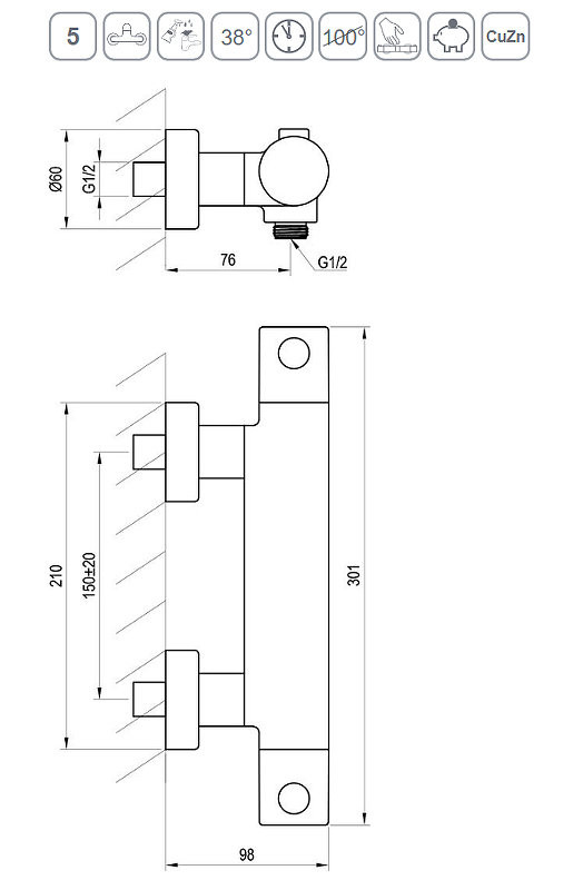 Смеситель настенный термостатический для душа без гарнитуры PU 033.20/150 черный