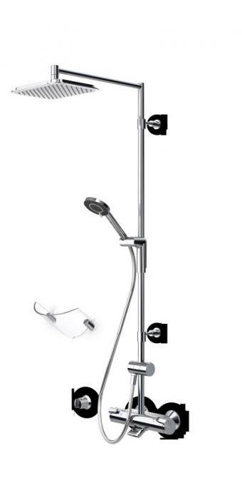 Термостатический смеситель для душа с душем Rain shower, изливом и ручным душем. Удобные рукоятки, легкий в использовании переключатель режимов и ограничитель температуры воды на рукоятке. Ограничитель расхода воды ECOFLOW. Ручной душ с несколькими режимами и защитой от известковых отложений для исключительного комфорта, держатель для душа и настенный кронштейн.