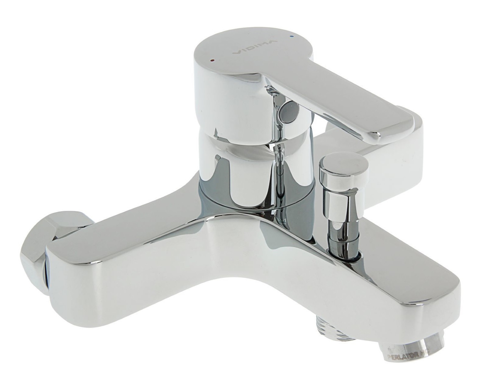 VIDIMA UNO Настенный смеситель для ванны/душа, монтаж на стандартных эксцентриках (в комплекте: эксцентрики, металлические отражатели, уплотнительные прокладки), литой излив 95 мм, аэратор Perlator, керамический картридж 35 мм, металлическая рукоятка с индикаторами горячей / холодной воды, ручное переключение ванна/душ