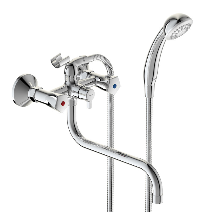 VIDIMA LIFE Смеситель для ванны/душа с керамическим переключателем, монтаж на стандартных эксцентриках (в комплекте: эксцентрики, металлические отражатели, уплотнительные прокладки), трубчатый поворотный излив 250 мм, от стены 309 ÷ 314, угол поворота 360˚, аэратор Perlator, керамические кранбуксы с поворотом 180˚, пластиковые рукоятки, индикатор холодной/горячей воды, ручное переключение ванна/душ, душевой гарнитур в комплекте (душевая лейка Ø70 мм, металлический шланг 1500 мм, держатель для лейки)