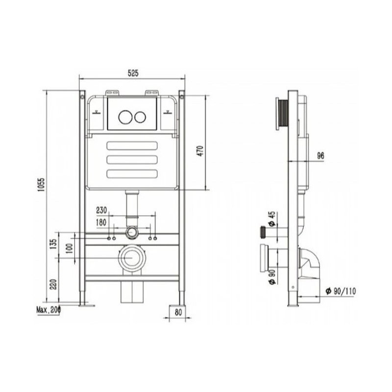 Монтажная рама изготовлена из стального профиля толщиной 2 мм, что гарантирует прочность и стабильность конструкции. Универсальный монтаж позволяет установить инсталляцию для подвесного унитаза с межосевым расстоянием 180 или 230 мм. Благодаря низкому уровню шума заливного клапана (менее 20 дБ) использование инсталляции будет комфортным и приятным.