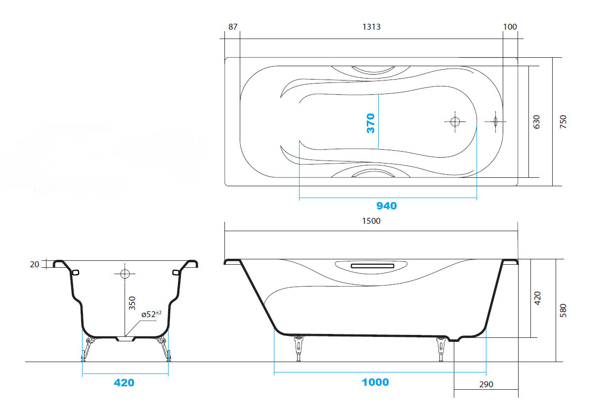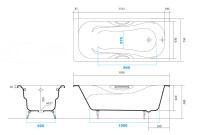 AQ8050FH-00 ГАММА ванна чугунная эмалированная 1500x750 в комплекте с 4-мя ножками и 2-мя ручками