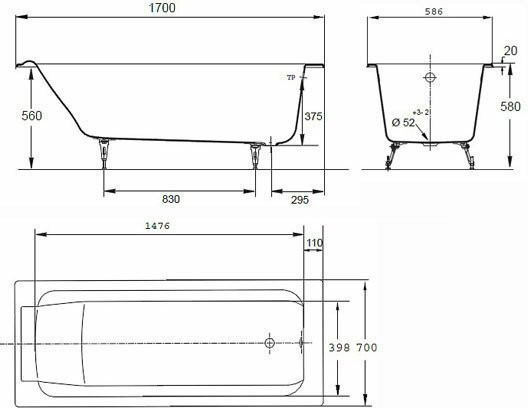 PARALLEL E2947-S-00 Ванна 170 х 70 см без отверстий для ручек БЕЗ АНТИСКОЛЬЗЯЩЕГО ПОКРЫТИЯ