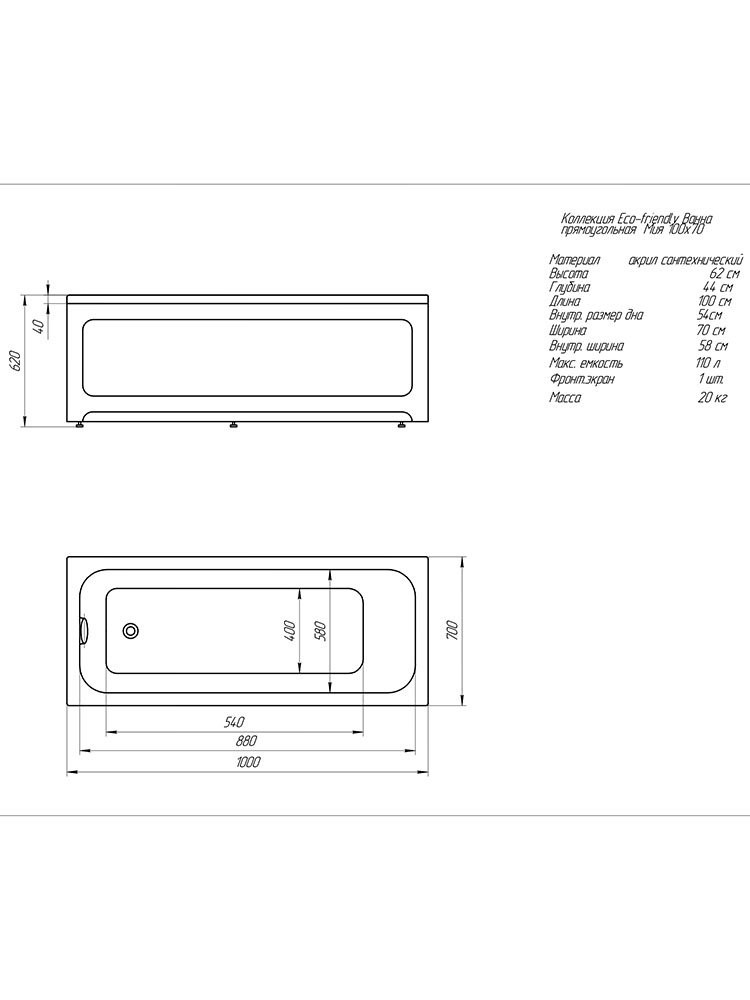 Ванна Мия прямоугольная 100*70 см