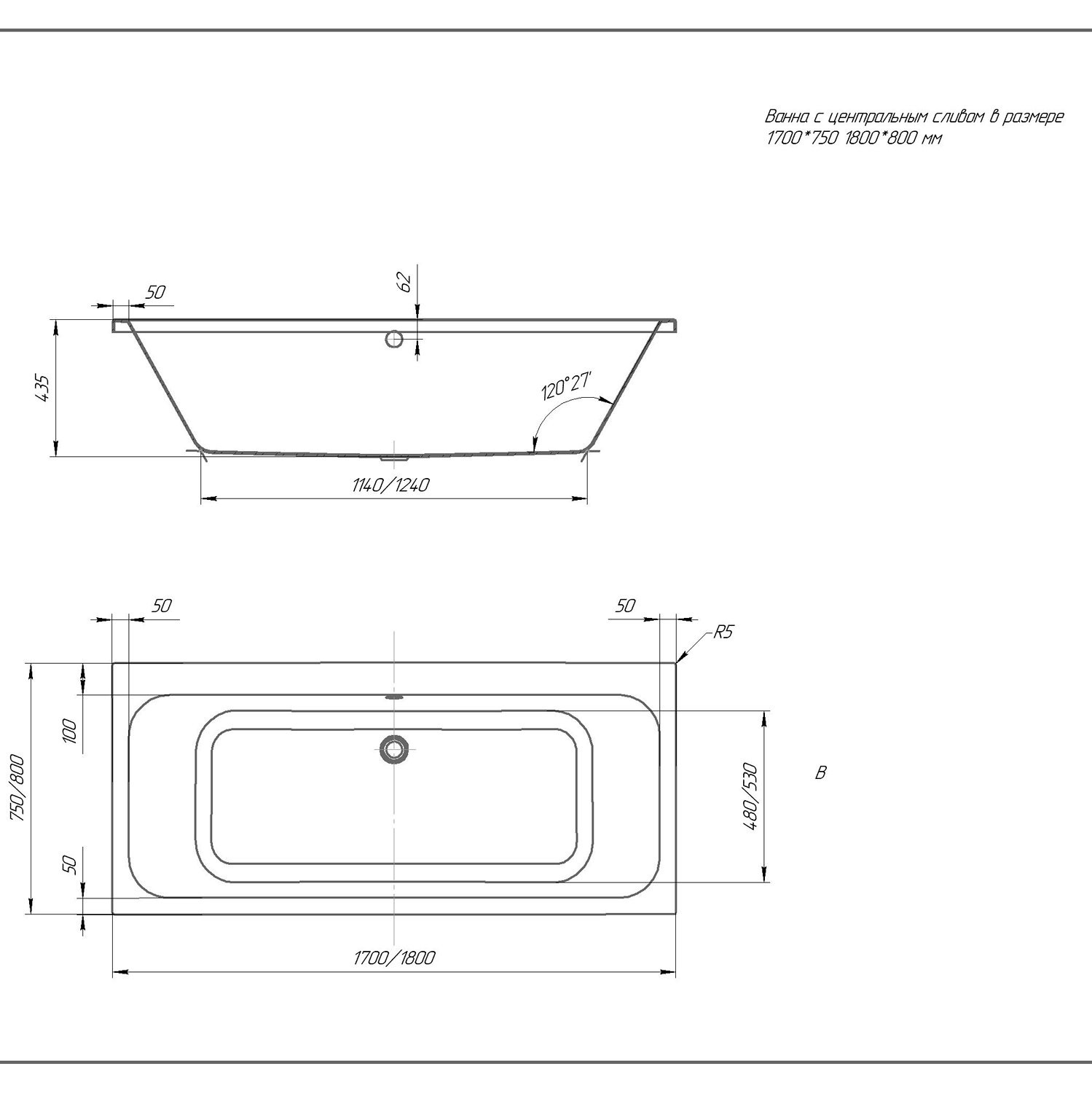 Ванна Мия прямоугольная 180*80см с центральным сливом