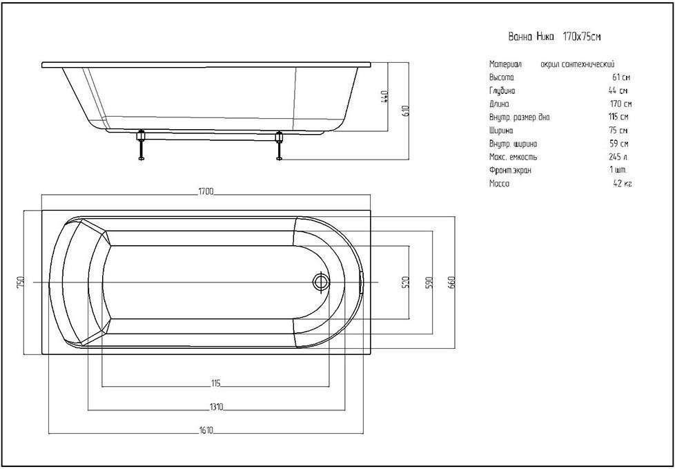 Ванна Ника прямоугольная 170*75см