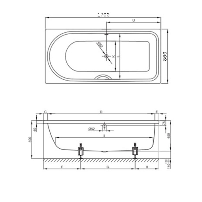 Ванна с шумоизоляцией 170х80х45, перелив сзади, с BetteGlasur ® Plusl и покрытием анти-слип, белая (для удлиненного слива-перелива)