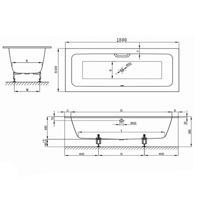 Ванна с шумоизоляцией 180х80х42, цвет белый (для удлиненного слива-перелива)