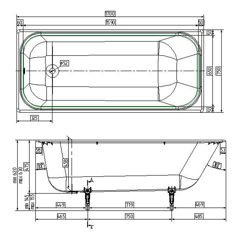 Wotte Start УР 1700х750х458 ванна чугунная c отверстиями для ручек (БП-э0001105)